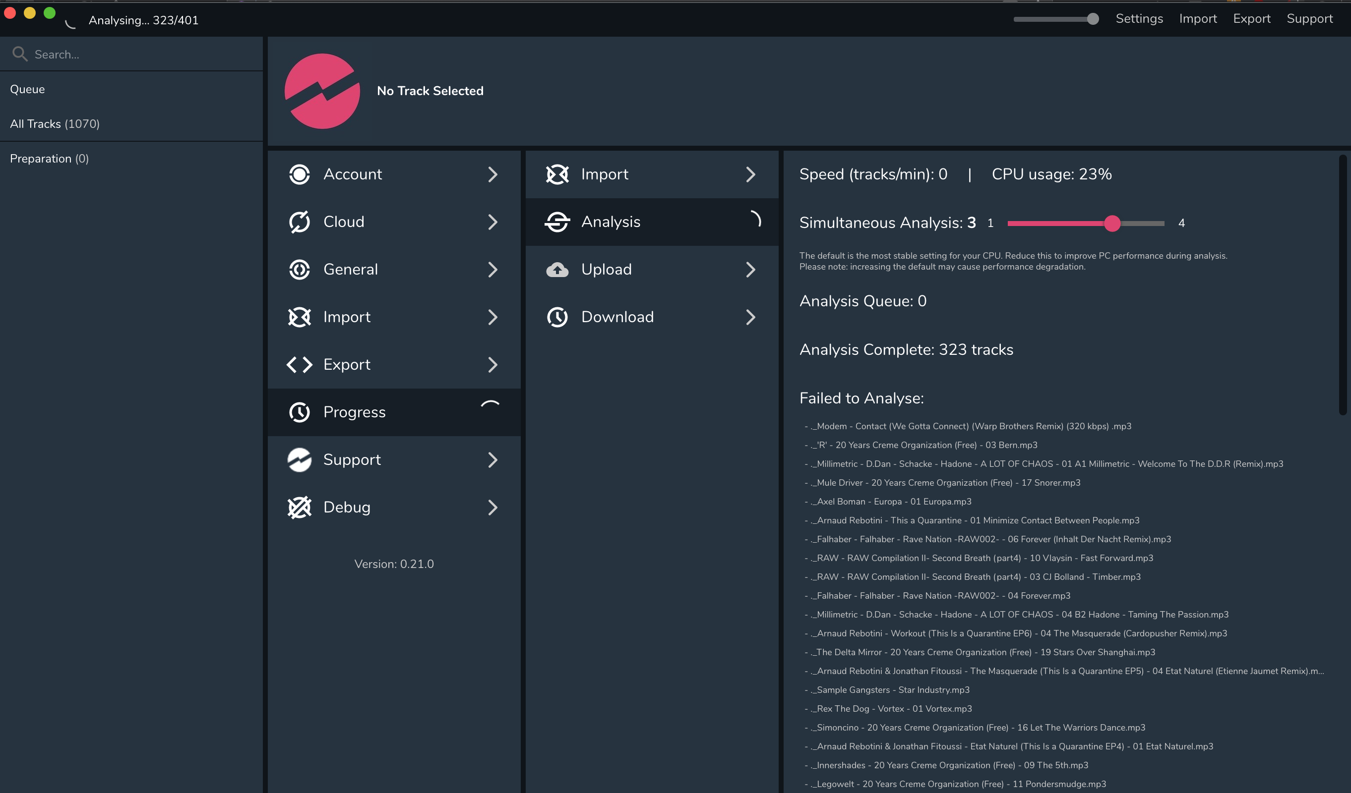 During the import of tracks, some of them failed to analyse. The process of analysing is now stuck; even though the Analysis Queue is 0, the number top-left still will not complete the process. When I add new tracks to be analysed, I have to reload the application through the Debug console; they will not be analysed otherwise because the process seems to be stuck on the analysing of failed tracks.