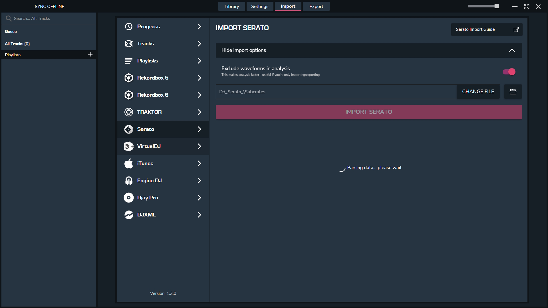 How long does it take for mixo to parse around 10000 serato tracks without doing waveform analysis? I ask because it stays for hours with the message "Parsing data, please wait ....."