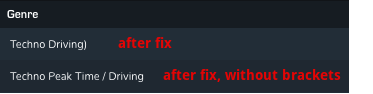 Hi, I noticed that MIXO cuts long genre names when importing songs. For example Beatport genre "Techno (Peak Time / Driving)" turns into "Driving)".