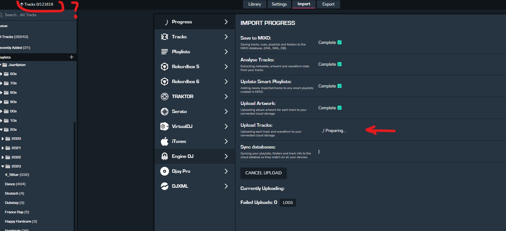 The new tracks appear in the playlist, so far, so good, but the "import" process gets stuck on the upload step. I also see a strange number in the left upper corner of Mixo. An arrow pointing up with the word Tracks 0/121619.