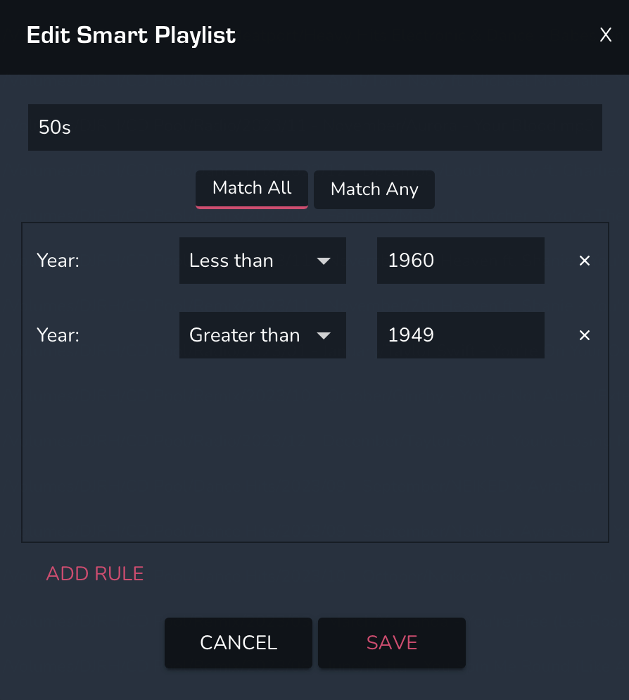 When creating a smart playlist for values between two points (e.g. year greater than 1949 and year less than 1960 in order to find all my 50s music) It fails to filter properly.