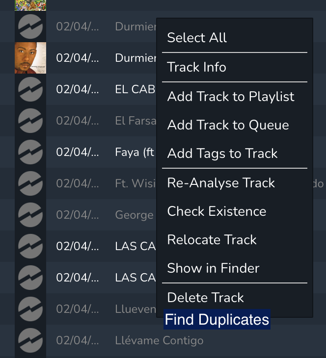 I would like to propose a "Find Duplicates" context menu item that allows the user to right-click a track and open it in the Duplicate Finder. If no duplicates of the track exist, a modal could appear alerting the user that the track has no duplicates.