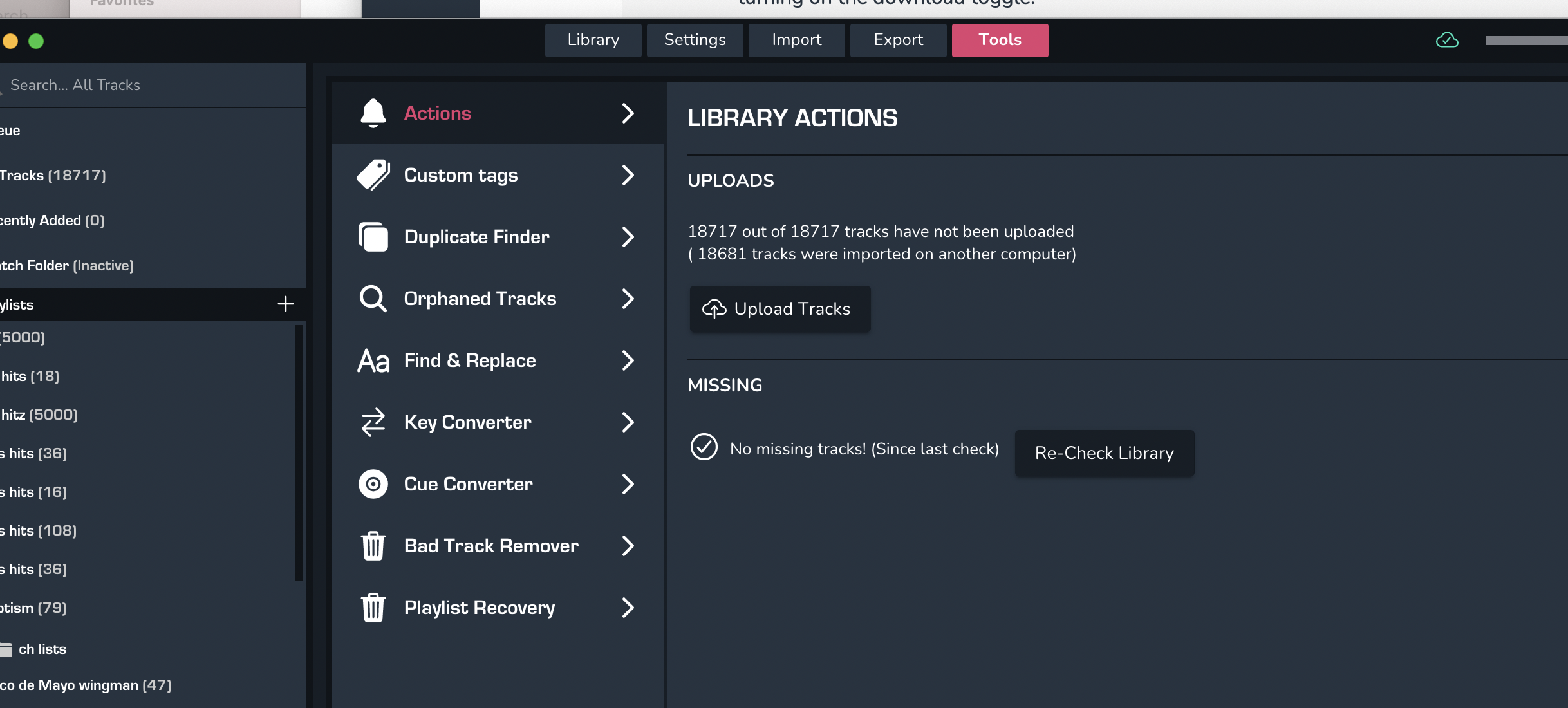 Yes so none of your tracks have been analysed or uploaded, So I have no idea where you imported from but the tracks don't actually exist locally.