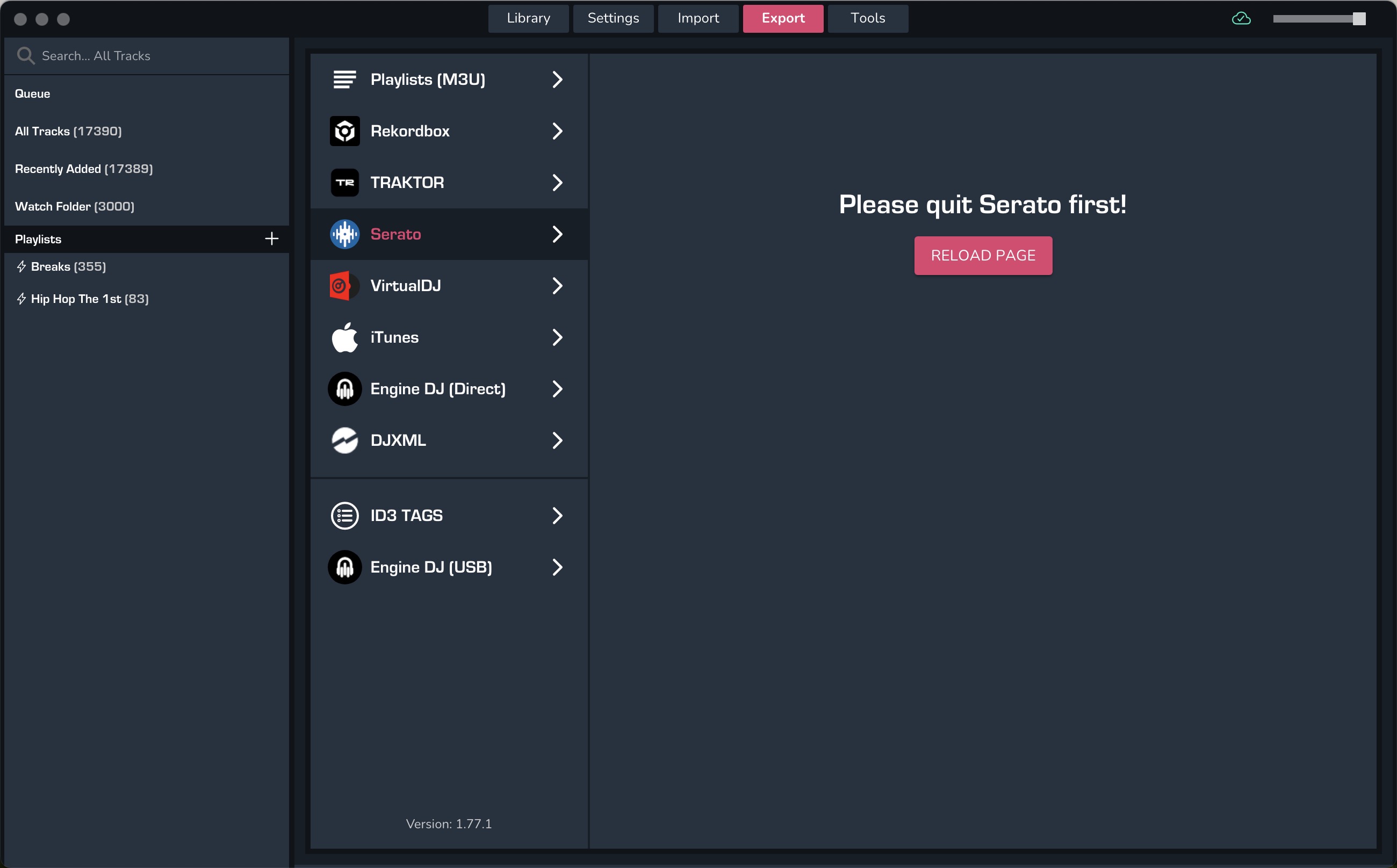 Under Import and Export for Serato, a message is displayed instead of the expected window content: Please Quit SERATO First.