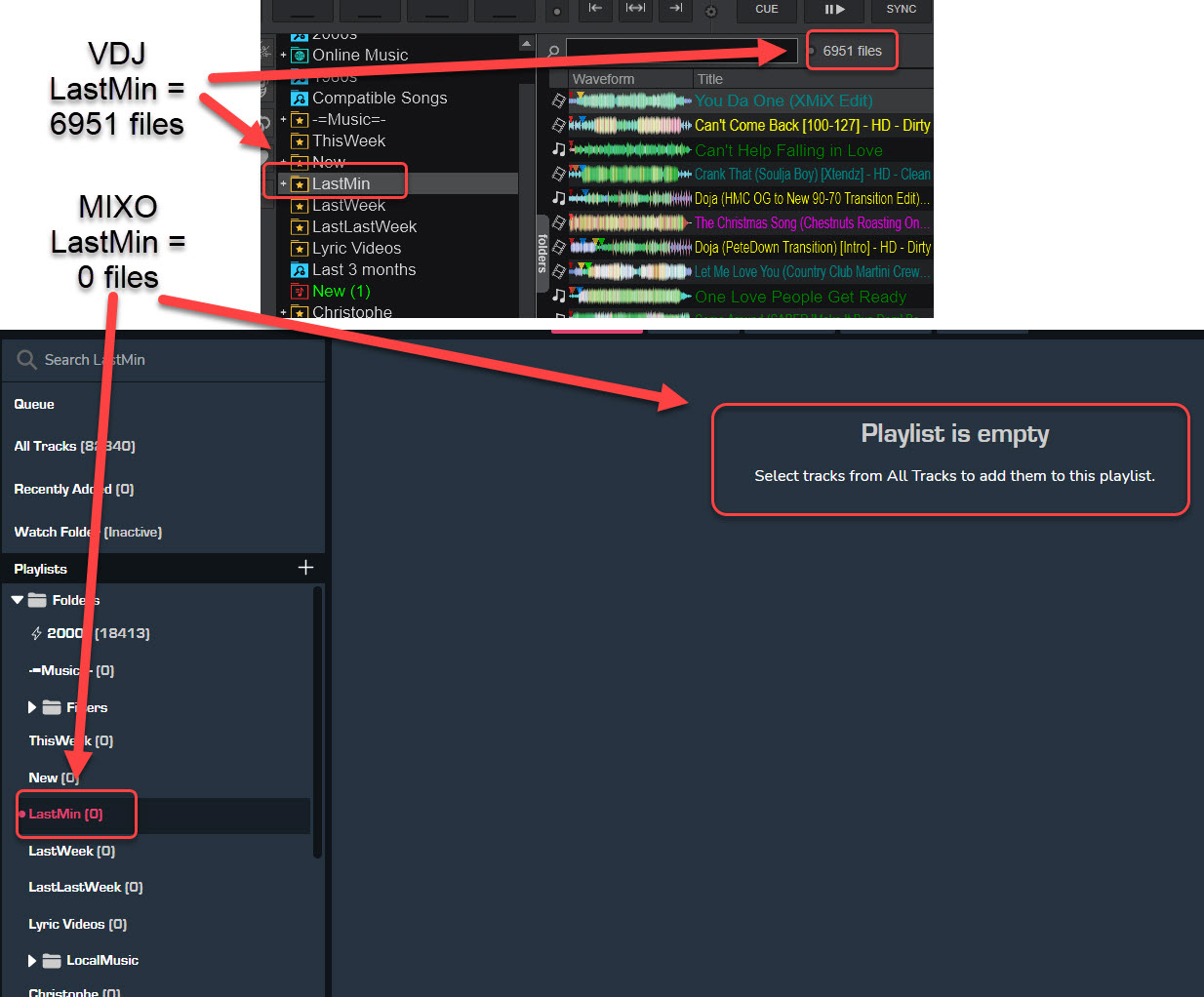 I have quite a large collection (68k songs). Importing seems to work, but some of my folders are not importing. Example in attached photo (LasMin folder should have 6951 entries, in MIXO after an error free import it has 0 entries