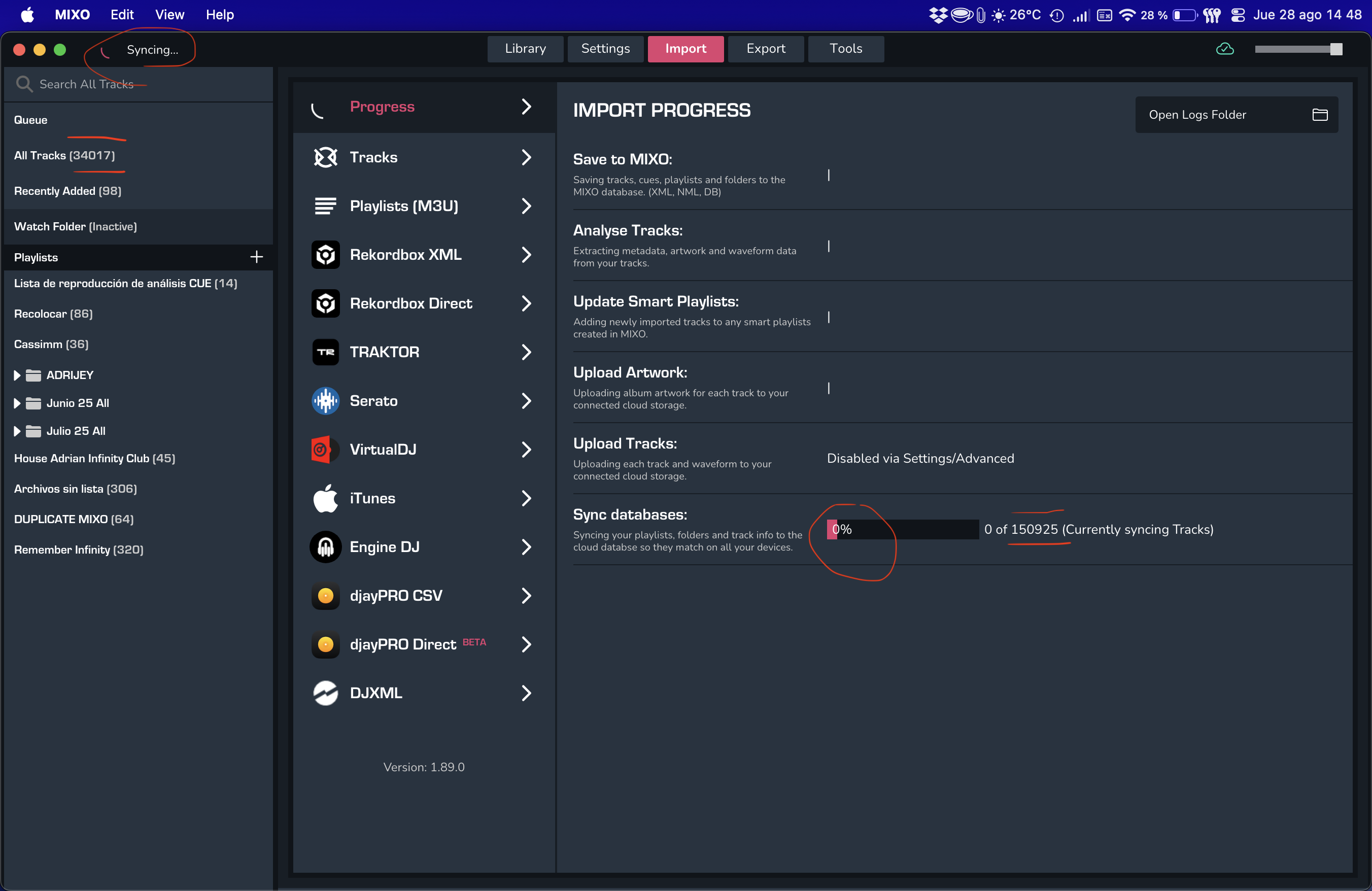 The program spends time indefinitely synchronizing the database. I have had it open for more than 24 hours and it always appears in this state. It also indicates that it is synchronizing many more tracks than I have, even though it is always at 0%.
