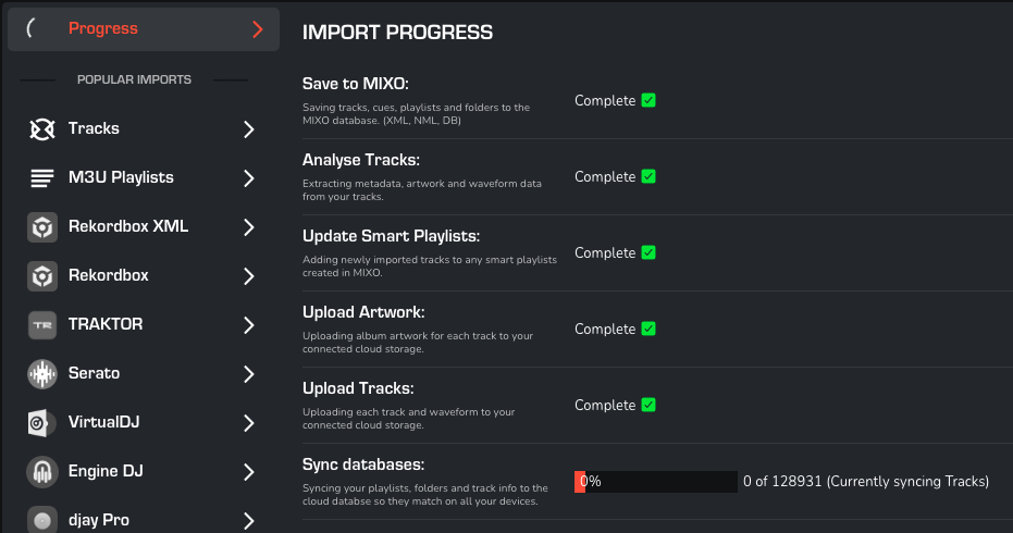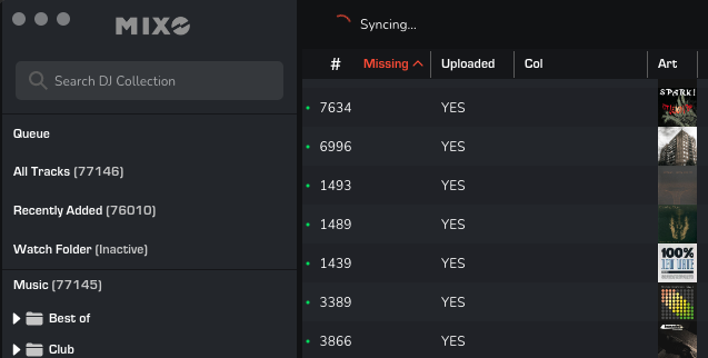 no matter what cloud I choose, Mixo never gets ready with syncing the databases. Tracks, covers and waveforms are uploaded, but nothing else.