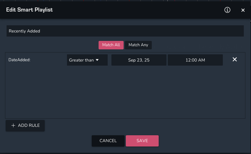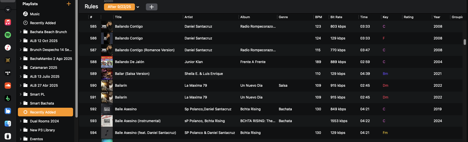 I have a "Recently added" smart playlist that I created in Mixo. This folder rules are correctly created when exporting to DJay. However, the "DateAdded" field is being replaced with the current date when doing the export. This results in the smart playlist not working correctly inside DJay Pro (it adds all the files in the DB to the playlist).